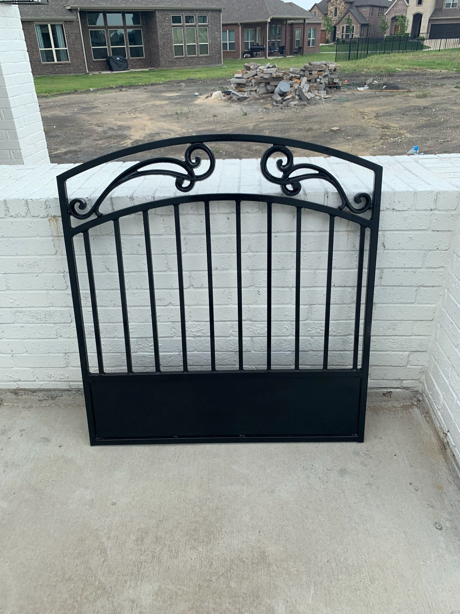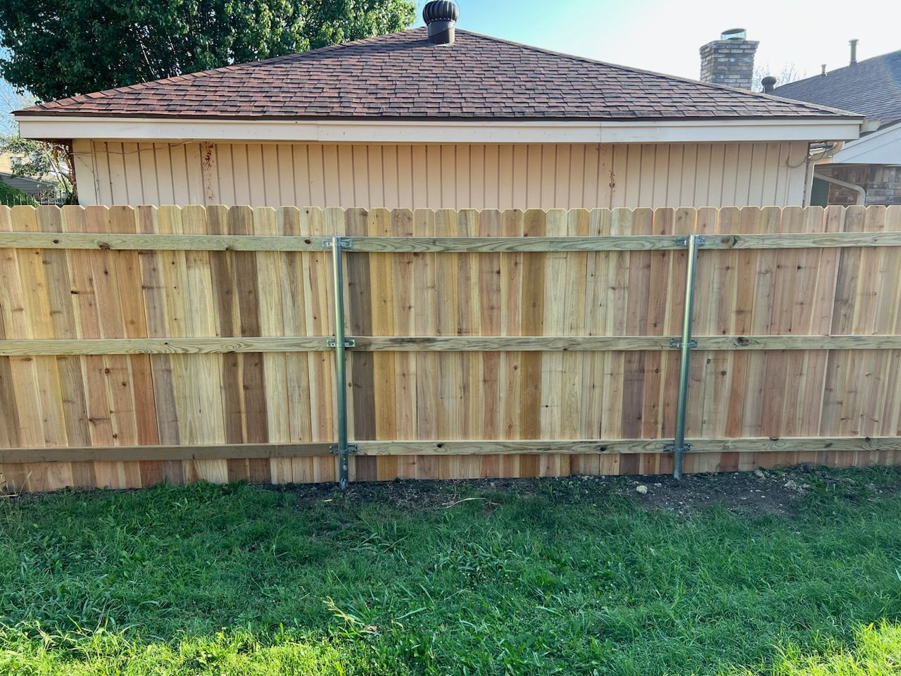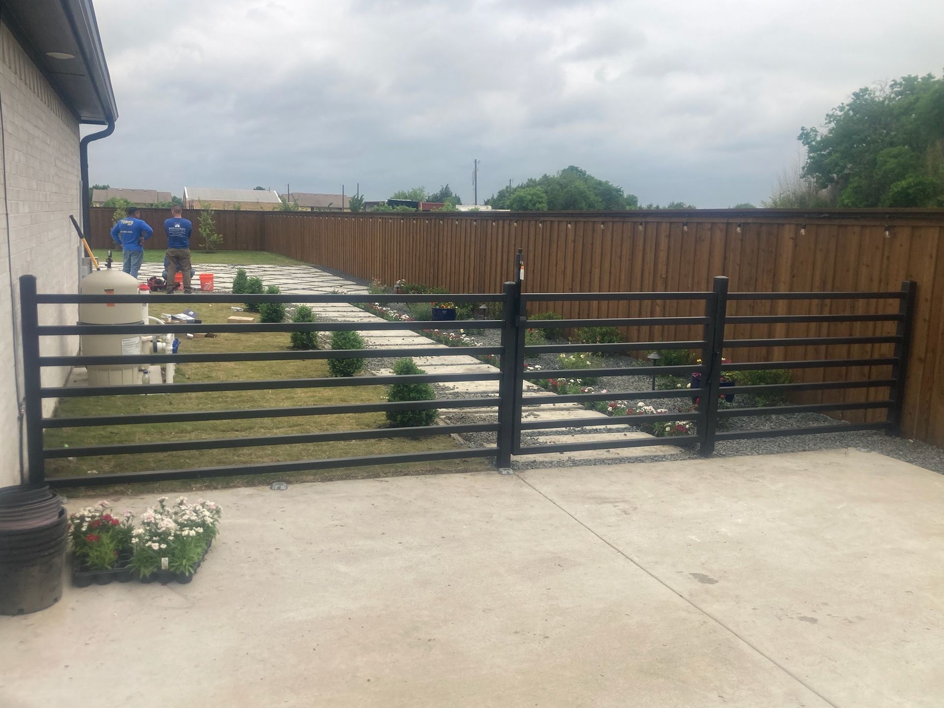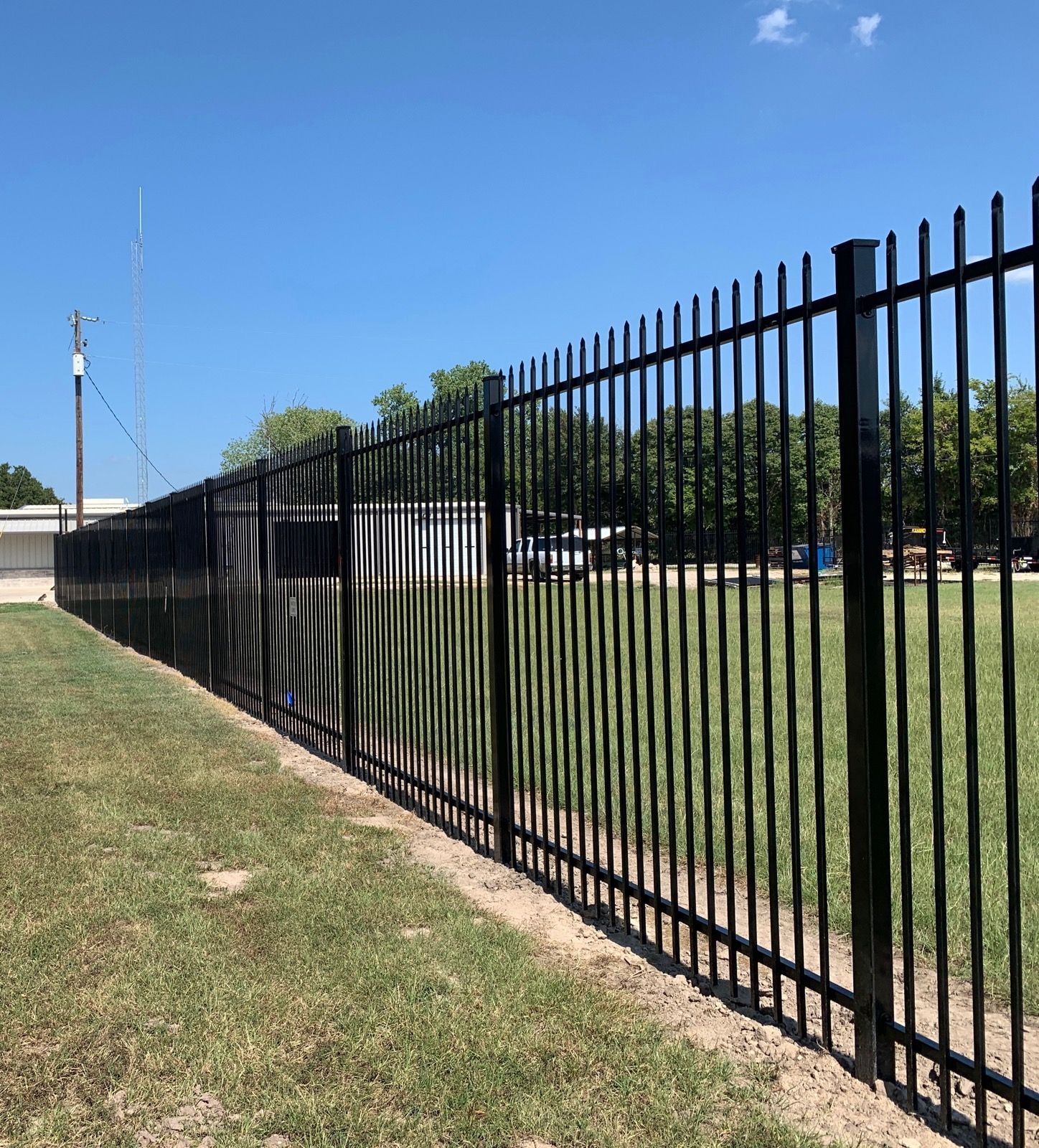 Completed metal fence project using prefabricated panels and square tubing posts