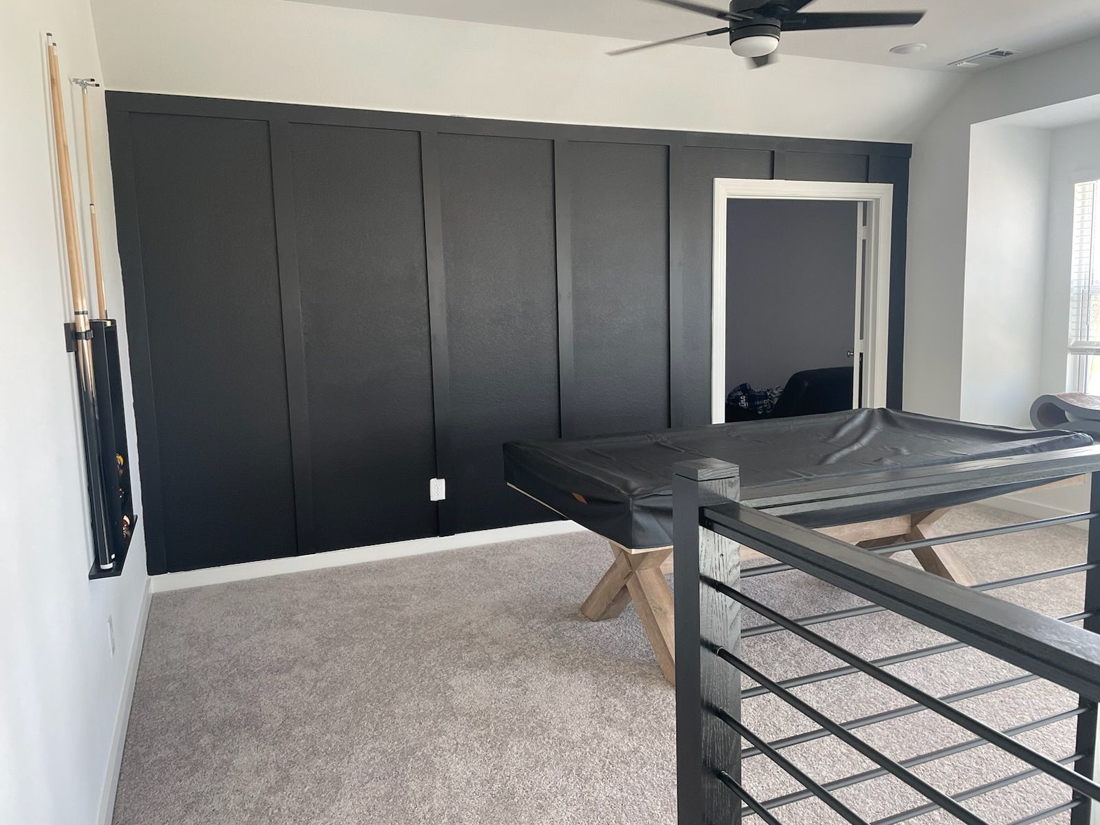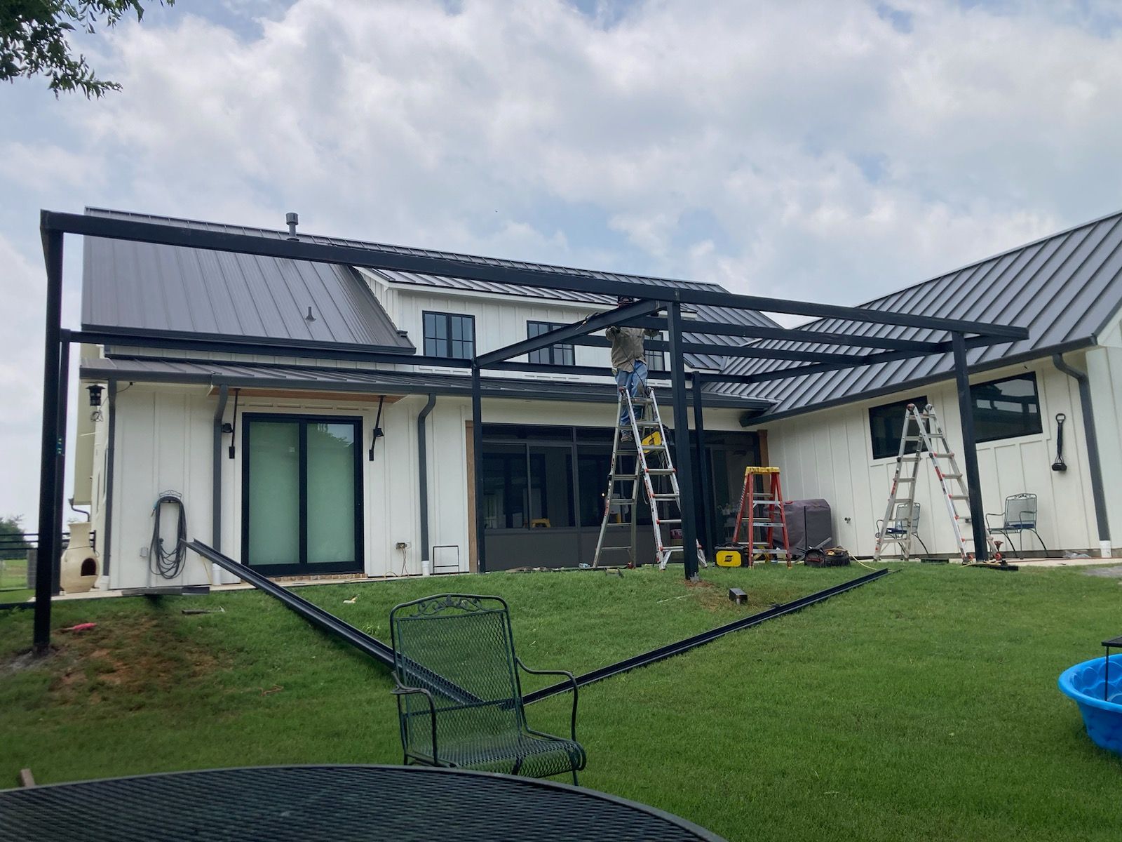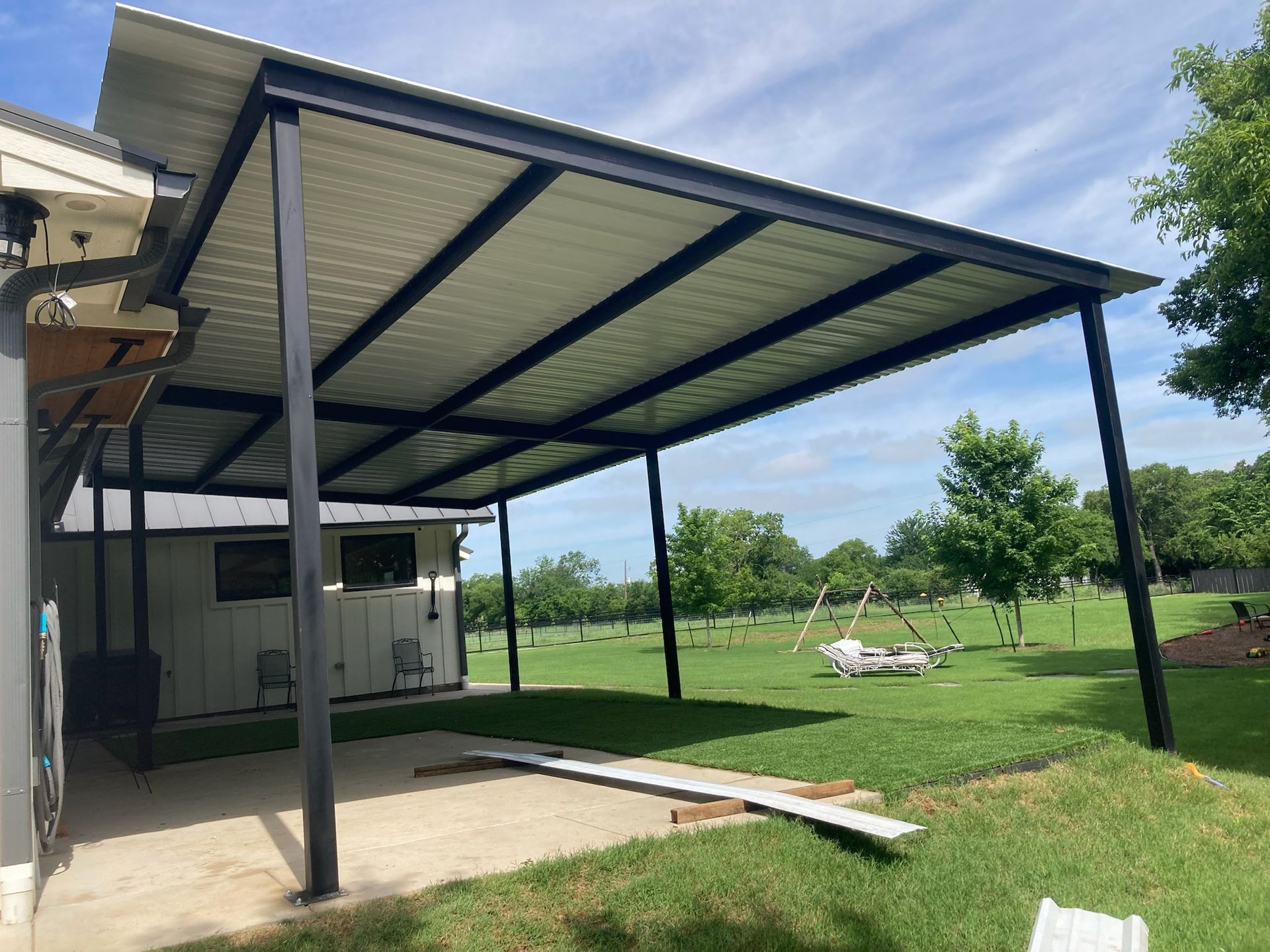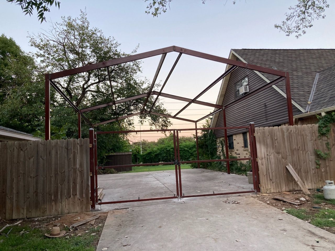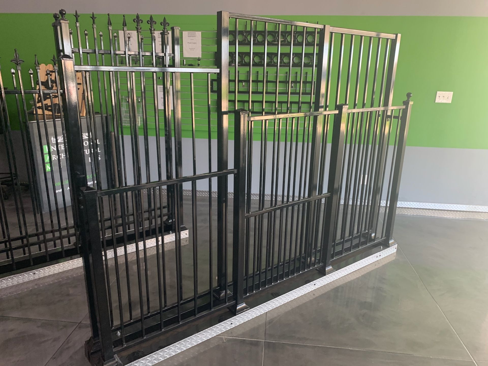 Completed metal fence project using prefabricated panels and square tubing posts